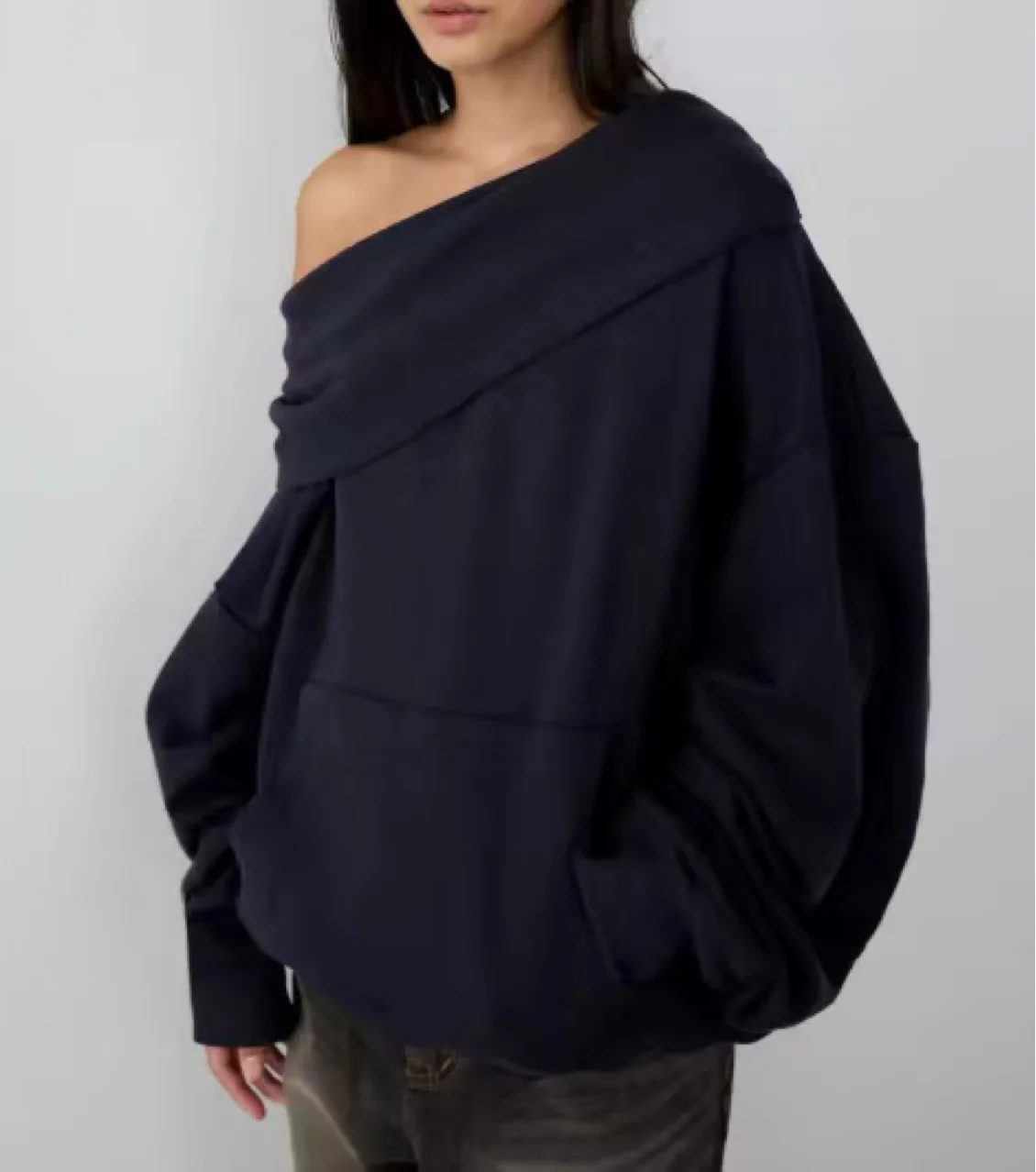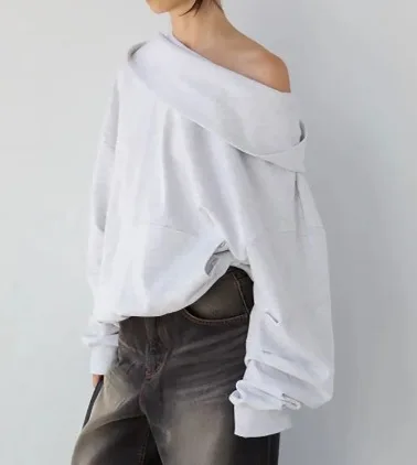 Off-The-Shoulder Hoodie 2025 Autumn Winter Solid Color Hooded Sweatshirt for Women Loose Comfortable Laid-back Streetwear Style