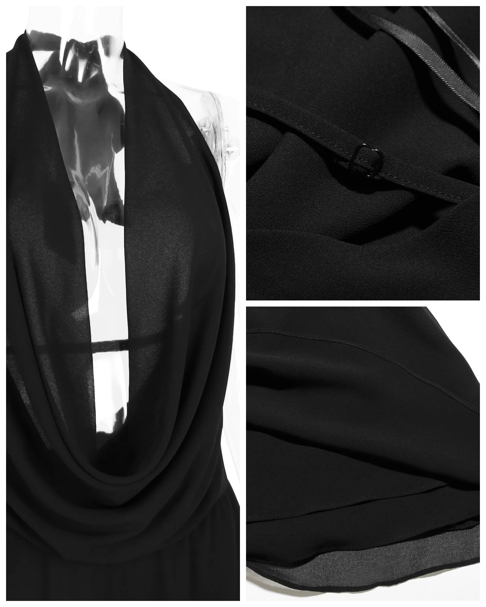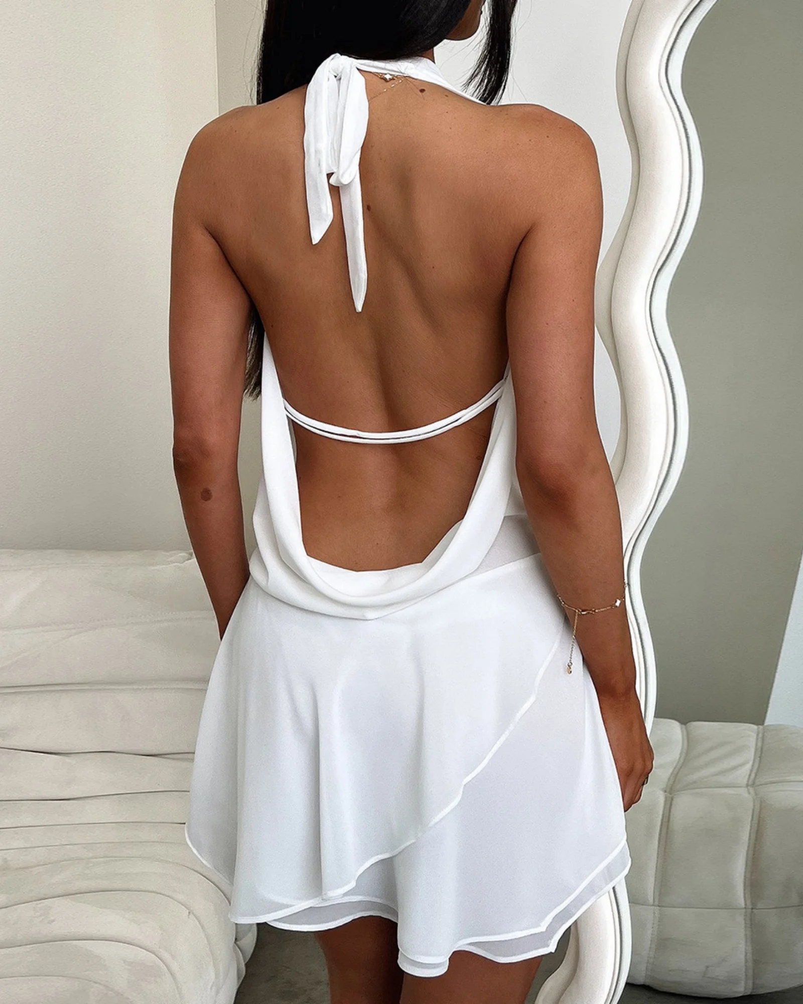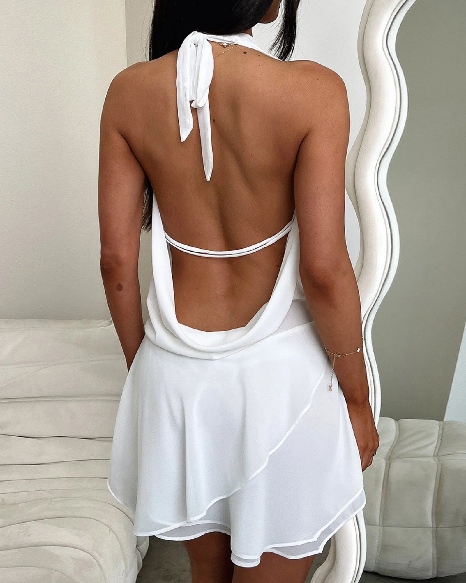 Feature: This layered mini dress features a plunge v cowl neckline and open back for a sexy yet sophisticated look. Complete the ensemble with the included neck tie and adjust the back for a perfect fit. The unique irregular ruffle hem adds a playful and trendy twist to this mini dress.