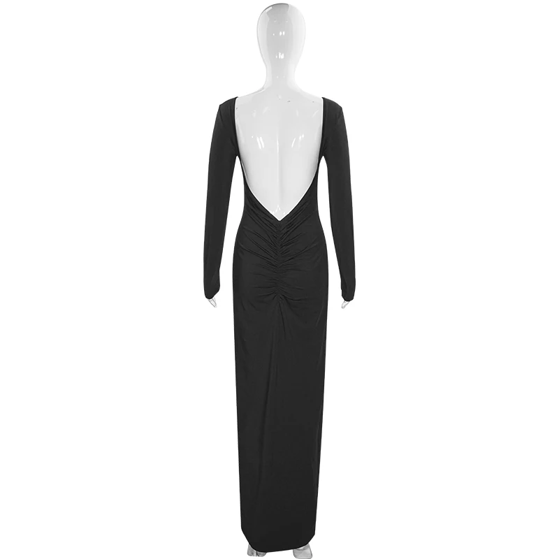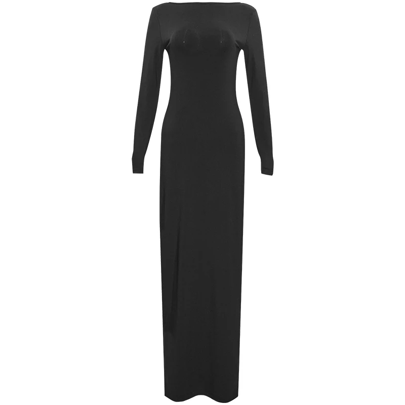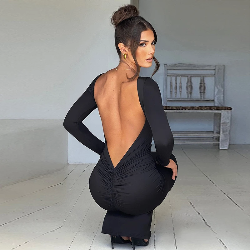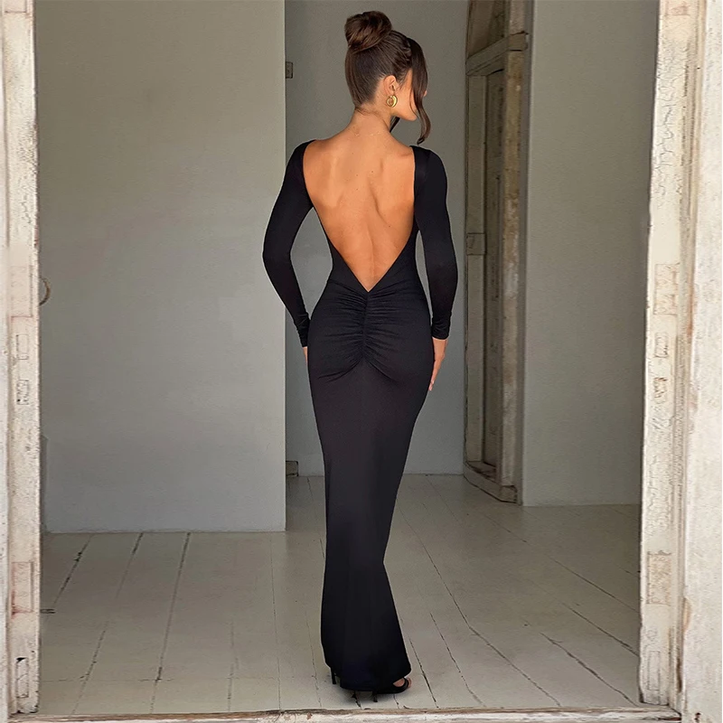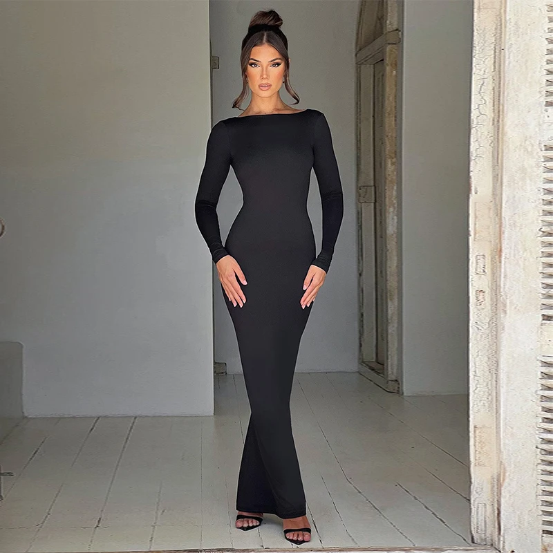 Sexy European And American Girl Pure Color Slim Fit Long Sleeve Backless Dress Spring 2025 New Arrival Elegant Evening Gown